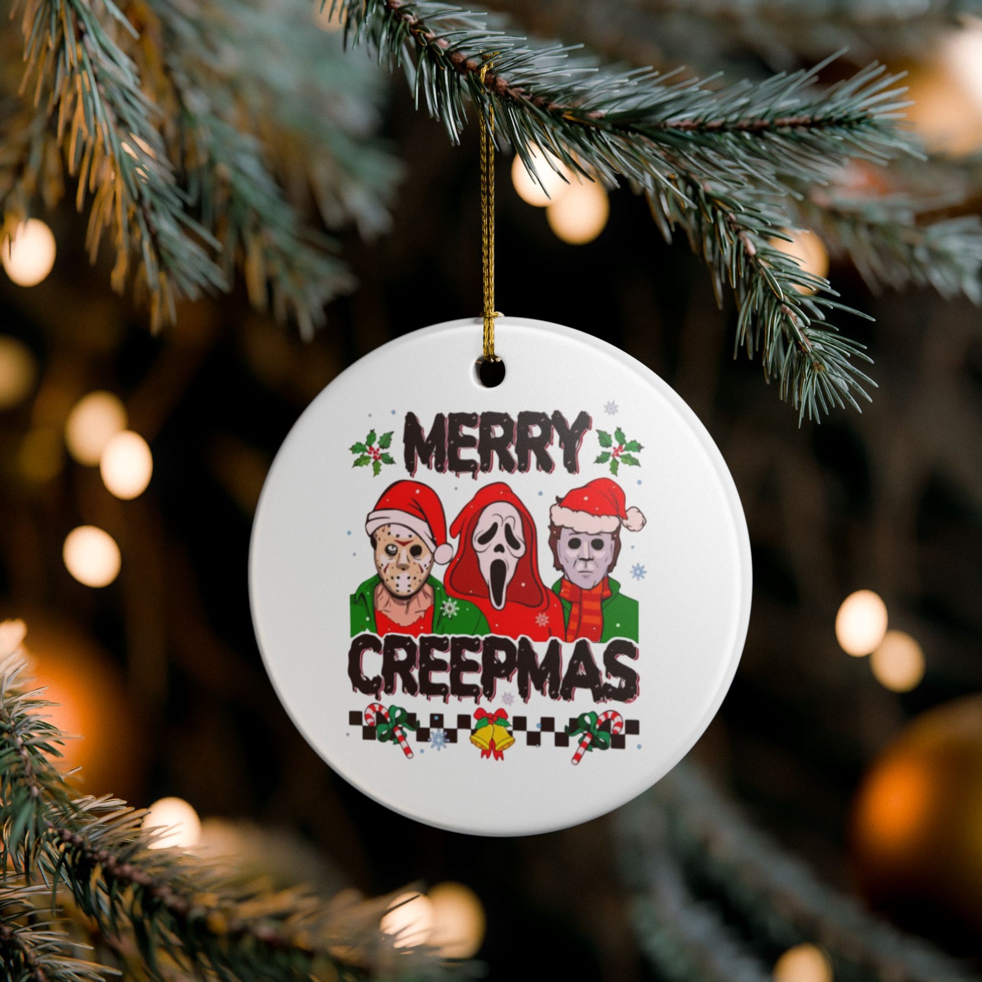 This glossy white ceramic ornament brings holiday mischief to your tree with a dark-humor twist. Three iconic masked horror characters wear Santa hats above the cheeky ‘Merry Creepmas’ lettering, surrounded by tiny holly, snowflakes and candy-cane accents. Lightweight and sturdy, it hangs from the included gold string and shows the vibrant UV-printed image on one side while the reverse remains clean and bright. It feels festive with an edge — for nights when you want your holiday decor to grin mischievously instead of behaving itself.